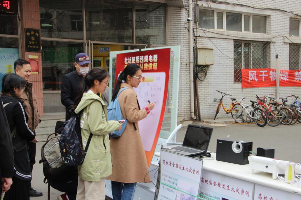 宣传期间,工作人员向同学们发放了消防知识宣传单,解答学生提出的各类安全方面的问题;通过防火宣传片、宣传板向同学们展示近几年发生在高校的火灾,真实且直观的再现了触目惊心的火灾场面,为全校师生敲响了安全防火的警钟,提高了消防安全责任意识;现场还展示了学校宿舍禁止使用的违规电器(如:热得快、电暖宝、电褥子、吹风机、卷发器、劣质插排、变压器等),同学们纷纷在签名墙上留下了自己的名字,承诺杜绝使用违规用电器。活动现场师生们纷纷驻足观看、积极探讨。很多同学表示此次宣传教育活动使自己获益良多,深刻认识到平时很多习惯都存在着极大的安全隐患,应加以重视,立行立改。